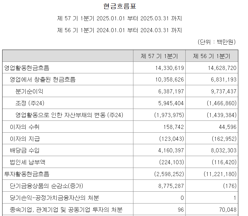 → 당연한 소리겠지만, 매출이 꾸준히 증가하고 영업이익과 순이익이 안정적으로 흑자라면 좋은 신호입니다. - 현금흐름표 (Cash Flow Statement)