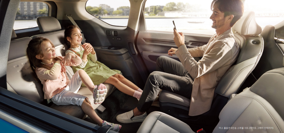 실내에서도 역시 다양한 편의를 제공하는 옵션들이 있는데요 그중에서 가장 눈에 띄는 것은 바로 스위블, 릴렉션 옵션입니다. EV9은 7인승이 기본 형태이며 옵션을 추가하여 6인승으로 변경할 수 있는데요, 6인승 시트 중 스위블, 릴렉션 옵션을 선택할 수 있습니다. 스위블 시트는 180도로 회전해 3열과 마주 볼 수 있는 형태로 사용이 가능하며, 릴렉션 시트는 원터치로 작동하는 릴렉션 모드 및 마사지 기능이 탑재되어 있습니다.