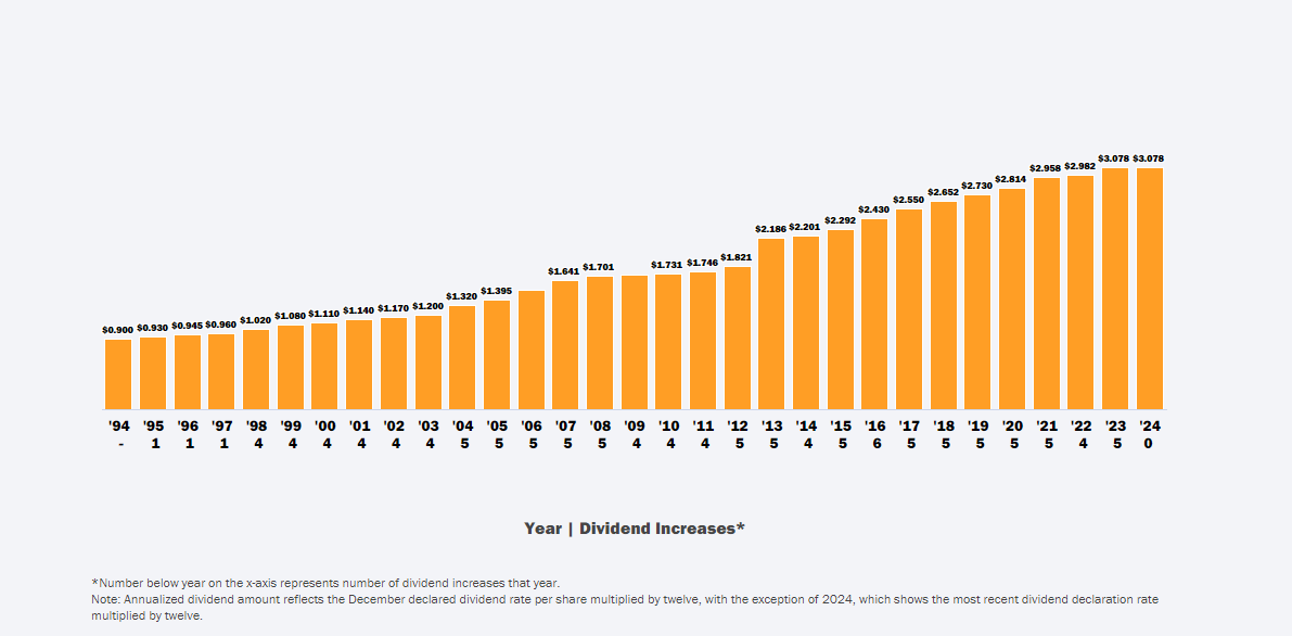 리얼티인컴의 상장 이후 배당금 지급 이력입니다. 그래프를 보시면 알 수 있듯이 상장이후 약 30년간 배당삭감이 단 한 번도 되지 않았습니다. 이 기간 중에는 닷컴버블붕괴 서브프라임 모기지사태 등이 포함되어 있는데도 말이죠. 과거의 데이터가 미래를 보장해 주는 것은 아니지만 이 정도의 데이터는 믿음이 생길 수밖에 없는 기업인 것 같습니다.
