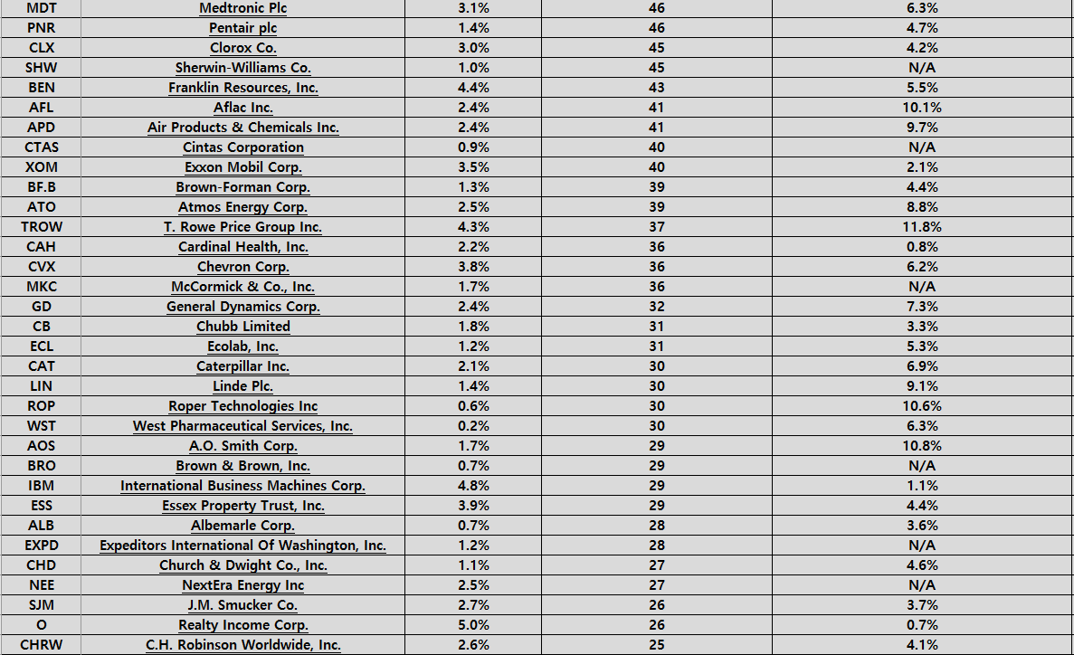 이번 포스팅에서는 미국의 배당귀족주 리스트를 확인해 보았습니다. 배당 종목을 선정함에 있어서 당장의 배당률도 중요하지만 그 기업이 탄탄하고 안정적인 성장을 보이는지가 굉장히 중요합니다. 배당을 장기간 늘려온 기업일지라도 계속해서 돈을 잘 벌어야 미래에도 배당금을 증가시킬 수 있기 때문이죠. 배당 투자자들에게는 장기간 배당을 늘려오면서도 배당이 꾸준히 성장하는 기업이 매력적인 기업이 됩니다.