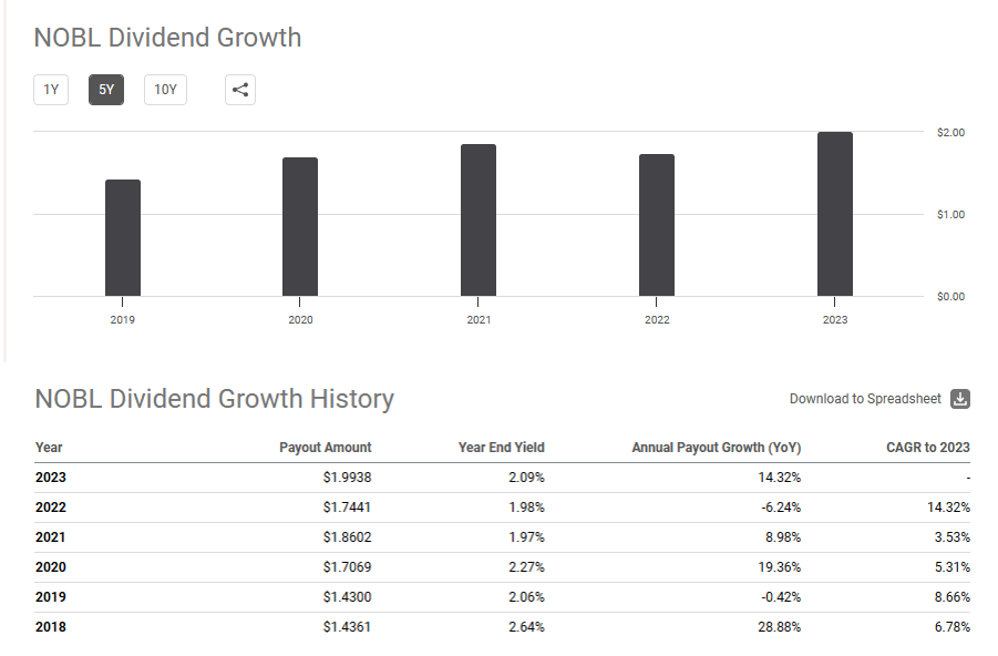최근 5년간 평균 배당성장률은 SCHD, DGRO, VIG, NOBL 순서로 높았습니다. 대부분의 ETF가 최근 5년간 배당금이 꾸준히 증가하였는데요, NOBL은 2019년, 2022년에 전년대비 배당금이 삭감되기도 하였습니다. 배당성장 ETF에서 배당금이 삭감되었다는 것은 굉장히 뼈아픈 일입니다. 배당성장을 믿고 투자하는 분들에게는 이 부분이 조금 선택에 영향을 줄 수 있지 않을까 생각합니다.