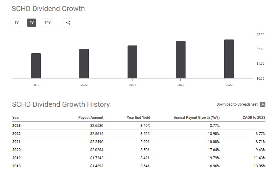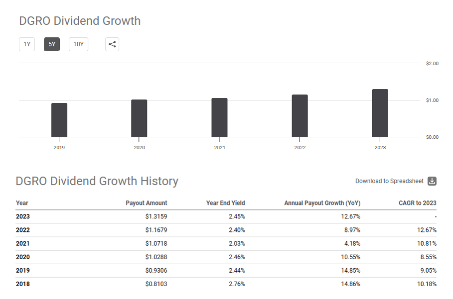 최근 5년간 평균 배당성장률은 SCHD, DGRO, VIG, NOBL 순서로 높았습니다. 대부분의 ETF가 최근 5년간 배당금이 꾸준히 증가하였는데요, NOBL은 2019년, 2022년에 전년대비 배당금이 삭감되기도 하였습니다. 배당성장 ETF에서 배당금이 삭감되었다는 것은 굉장히 뼈아픈 일입니다. 배당성장을 믿고 투자하는 분들에게는 이 부분이 조금 선택에 영향을 줄 수 있지 않을까 생각합니다.