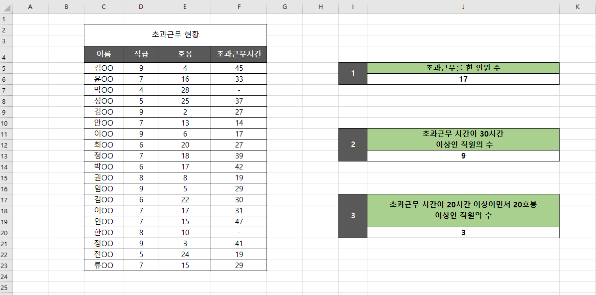 - 초과근무를 한 인원의 수는 간단하게 COUNT함수를 사용하여 =COUNT(F5:F23)으로 구할 수 있습니다.