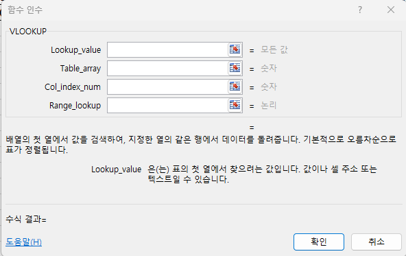 I4셀에서 함수VLOOKUP을 입력 후 확인버튼을 누르면 다음과 같은 창이 뜨게 됩니다.