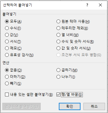 붙여 넣기 행/열 바꿈 기능