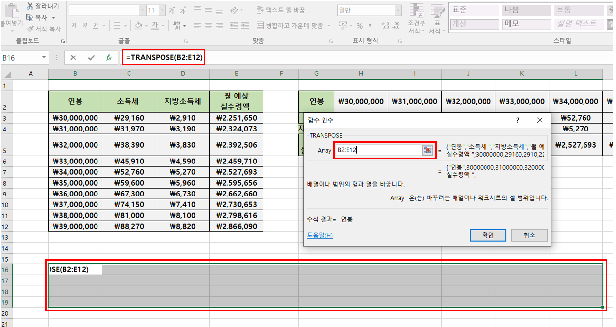 붙여 넣기 할 범위를 지정 후, TANSEPOSE 함수를 입력 한 뒤에 원본 데이터 범위를 설정해 줍니다. 그 후에 엔터가 아니라 'ctrl + shift + enter'를 입력해 줍니다.