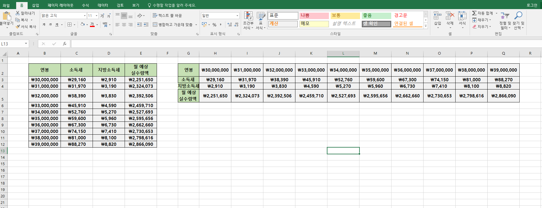아래쪽에 '행/열 바꿈' 옵션을 선택 후 '확인'을 누르면 다음과 같이 행/열 전환된 데이터가 생성됩니다.