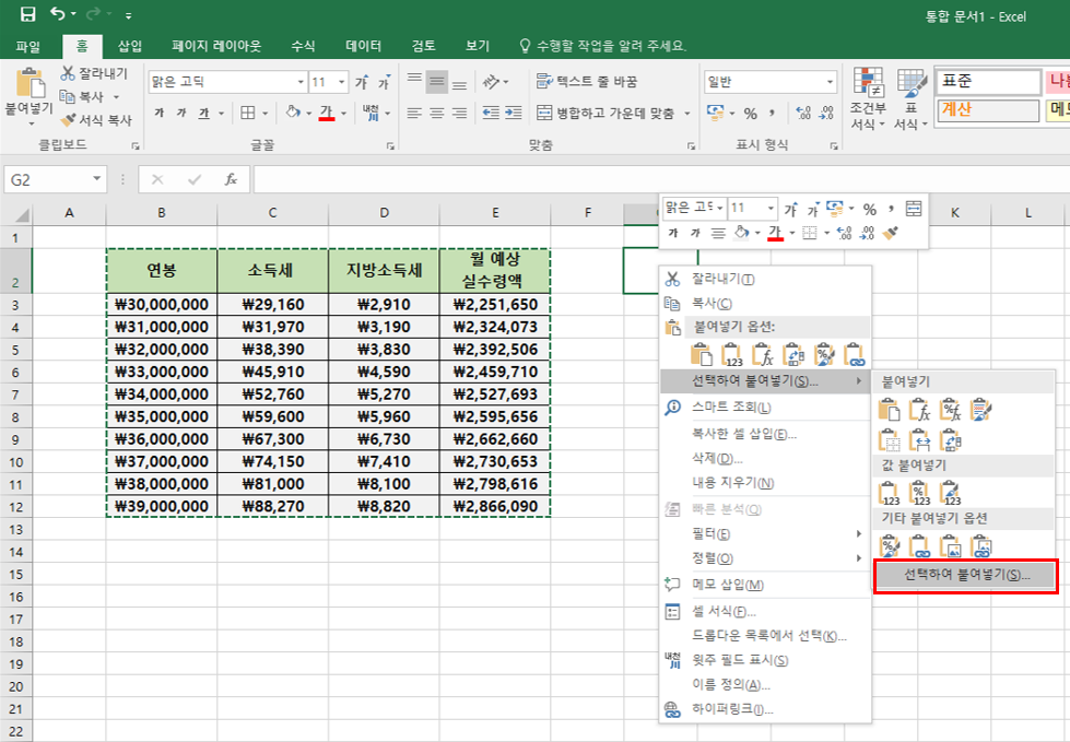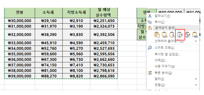 우클릭 후 다음과 같이 선택하여 붙여넣기 옵션을 바로 선택해도 무방합니다.