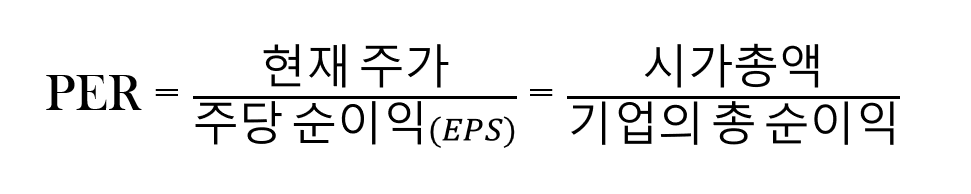 PER은 주식을 하시는 분들이 가장 먼저 접하는 용어가 아닐까 싶습니다. 한국어로 번역하면 Price = 주가, Earning = 수익, Ratio = 비율, 즉 주가수익비율이라는 용어가 되는데요, 수식으로 나타내면 다음과 같습니다.