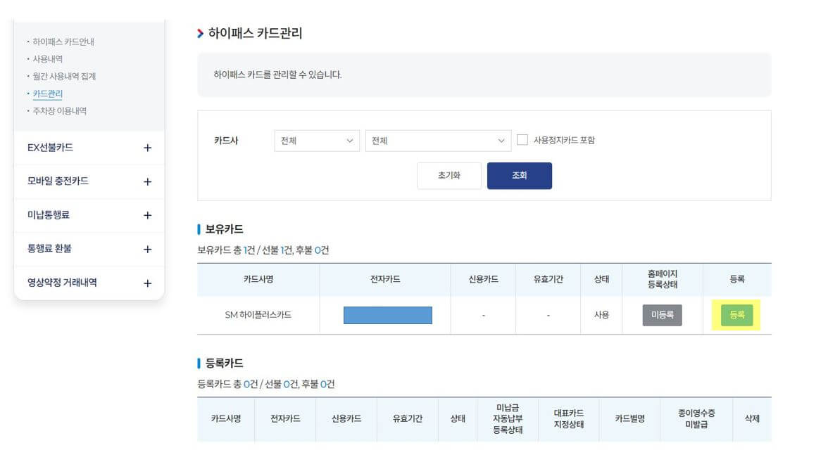 3. 처음 이용하시는 분들은 카드 등록이 되어있지 않으므로 우측에 있는 '카드등록' 버튼을 클릭합니다.