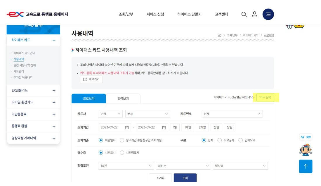3. 처음 이용하시는 분들은 카드 등록이 되어있지 않으므로 우측에 있는 '카드등록' 버튼을 클릭합니다.