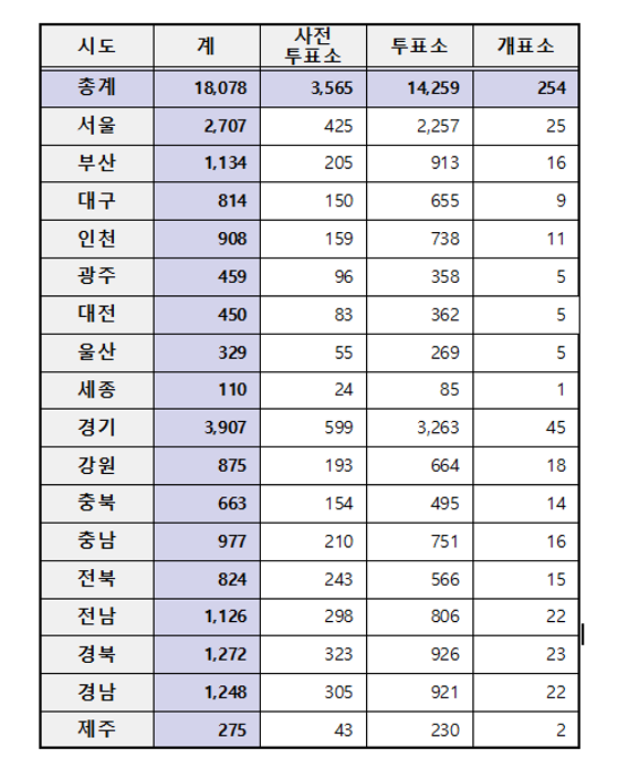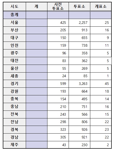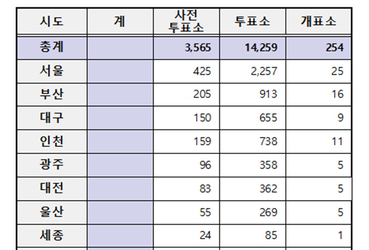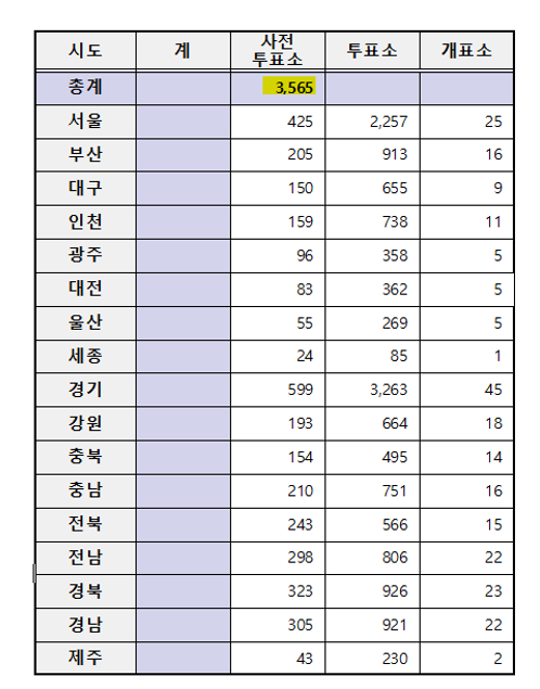 어떤 함수든지 방법은 동일하기 때문에 합계를 구하는 방법을 예시로 보여드리겠습니다. 아래 표와 같은 데이터에서 사전투표소의 합계를 먼저 구해보겠습니다.