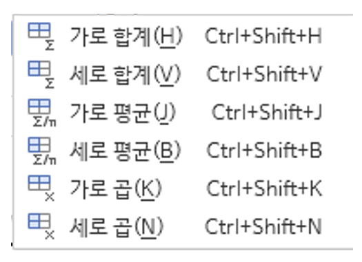 간단한 수식을 적용하기 위한 단축키를 알아보겠습니다. 합계, 평균, 곱에 대해서 다음과 같이 단축키를 사용할 수 있습니다. 단축키에 익숙해지면 훨씬 더 편리하게 수식을 삽입할 수 있겠죠.