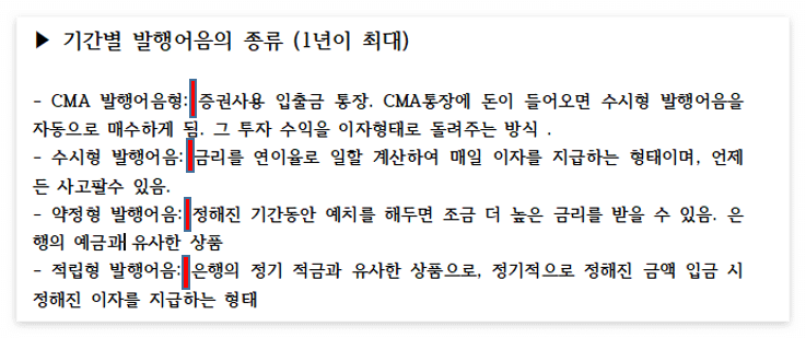 다음과 같이 작성한 문서가 있습니다. 여기에서 CMA 발행어음형 다음에 오는 설명 내용을 앞줄을 맞추면 훨씬 깔끔한 문서가 되겠죠.