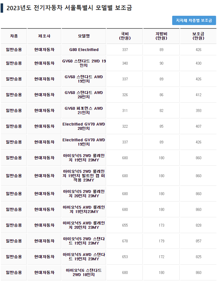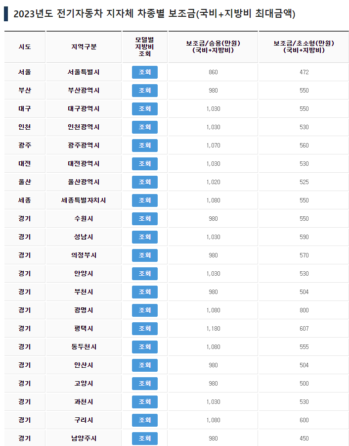 4. 지역별 / 차종별 전기차 보조금(국비 + 지방비)을 확인할 수 있습니다