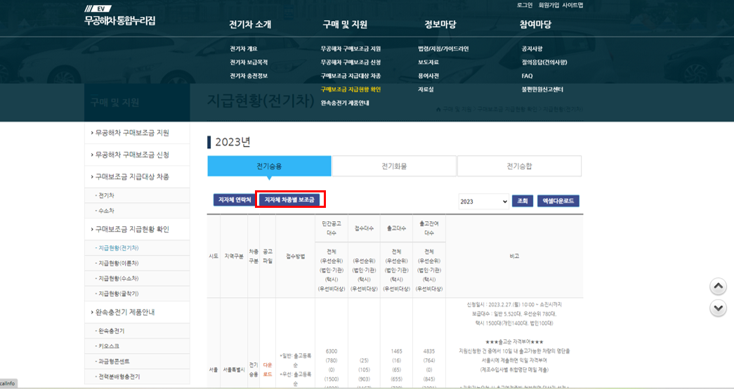 3. 지급현황(전기차) > 지자체 차종별 보조금 버튼을 클릭합니다.