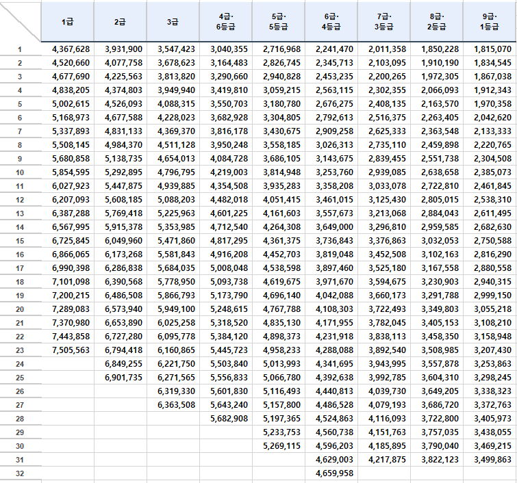 해당 표는 2023년 봉급표에 2.5%의 인상분을 반영하여 필자가 계산하여 작성한 표이니 참고만 해주시기 바랍니다.