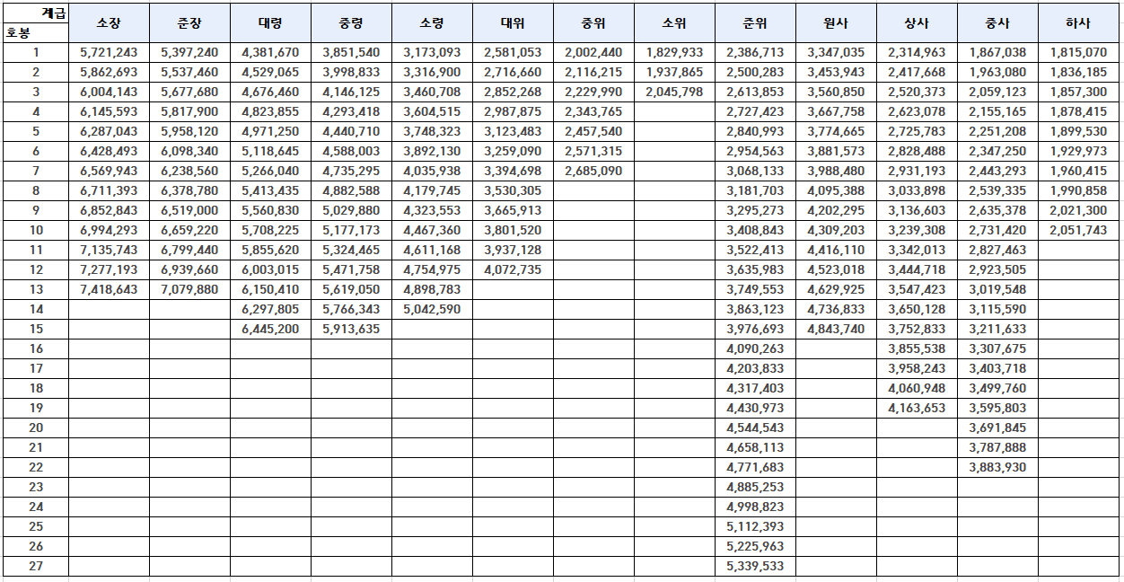 2024년 봉급 인상률이 적용된 군인 봉급표는 어떻게 될까요?