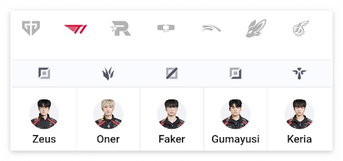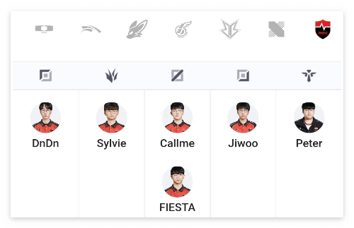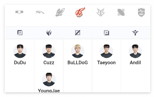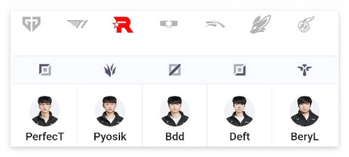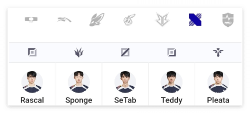 DRX입니다. 생소한 이름들이 많이 보이는데요, 베테랑 선수인 Rascal과 Teddy를 필두로 Sponge, SeTab, Pleata선수를 콜업하며 새로운 팀을 구성하였습니다. 새로운 선수들 위주로 구성된 팀인 만큼, 이번 시즌 어떤 경기력을 보여줄지 기대됩니다.