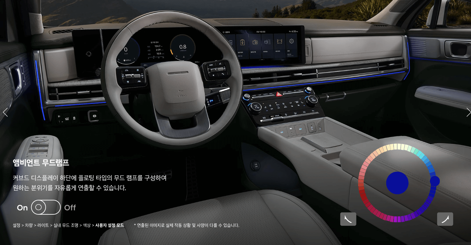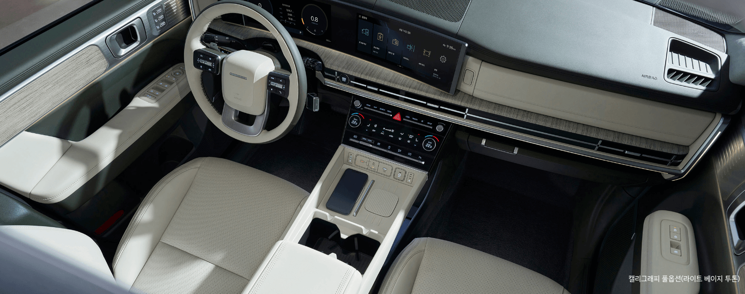 디 올 뉴 싼타페의 인테리어 입니다. 사진에서 보이는 색상은 캘리그래피 트림의 풀옵션 라이트 베이지 투톤 컬러를 선택한 모습입니다. 투톤 가죽 스티어링 휠을 사용하였고(블랙 인테리어 선택 시 미적용), 6.6인치 터치식 공조 디스플레이를 도입하였습니다. 또한 계기판과 내비게이션이 일체화 12.3인치 파노라믹 커브드 디스플레이를 사용하였으며, 원하는 색상을 설정할 수 있는 앰비언트 무드램프를 통해서 다양한 실내 분위기를 연출할 수 있습니다.