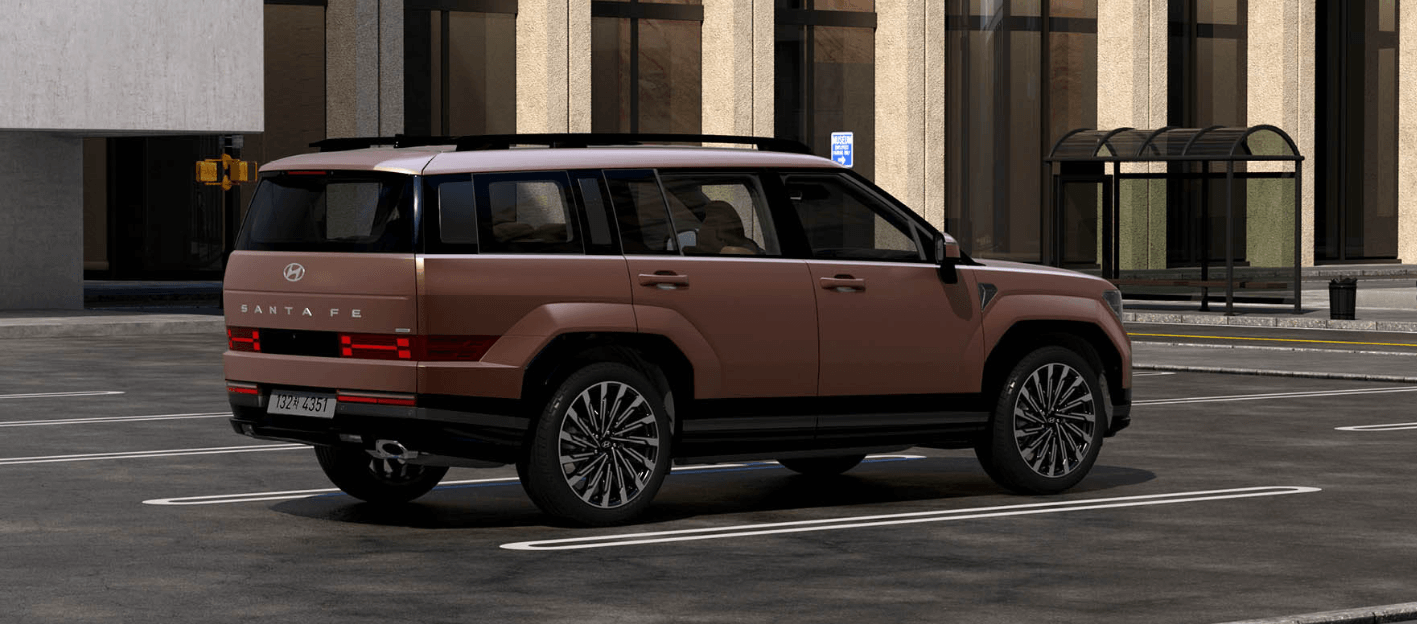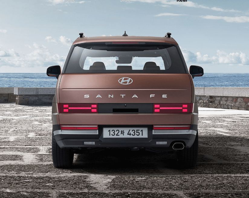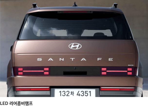 2024 싼타페의 익스테리어 디자인입니다. 풀체인지 모델로 이전 모델의 모습을 찾아볼 수 없을 정도로 크게 변화를 주었습니다. 먼저 앞부분에는 라디에이터&인테이크 그릴을 사용하였으며, 전면에는 프로젝션 타입의 Full LED 헤드램프, 후면에는 LED 리어콤비램프를 사용하였습니다. 또한 싼타페만의 개성 있는 형태의 램프를 사용하여 포인트를 주었습니다.