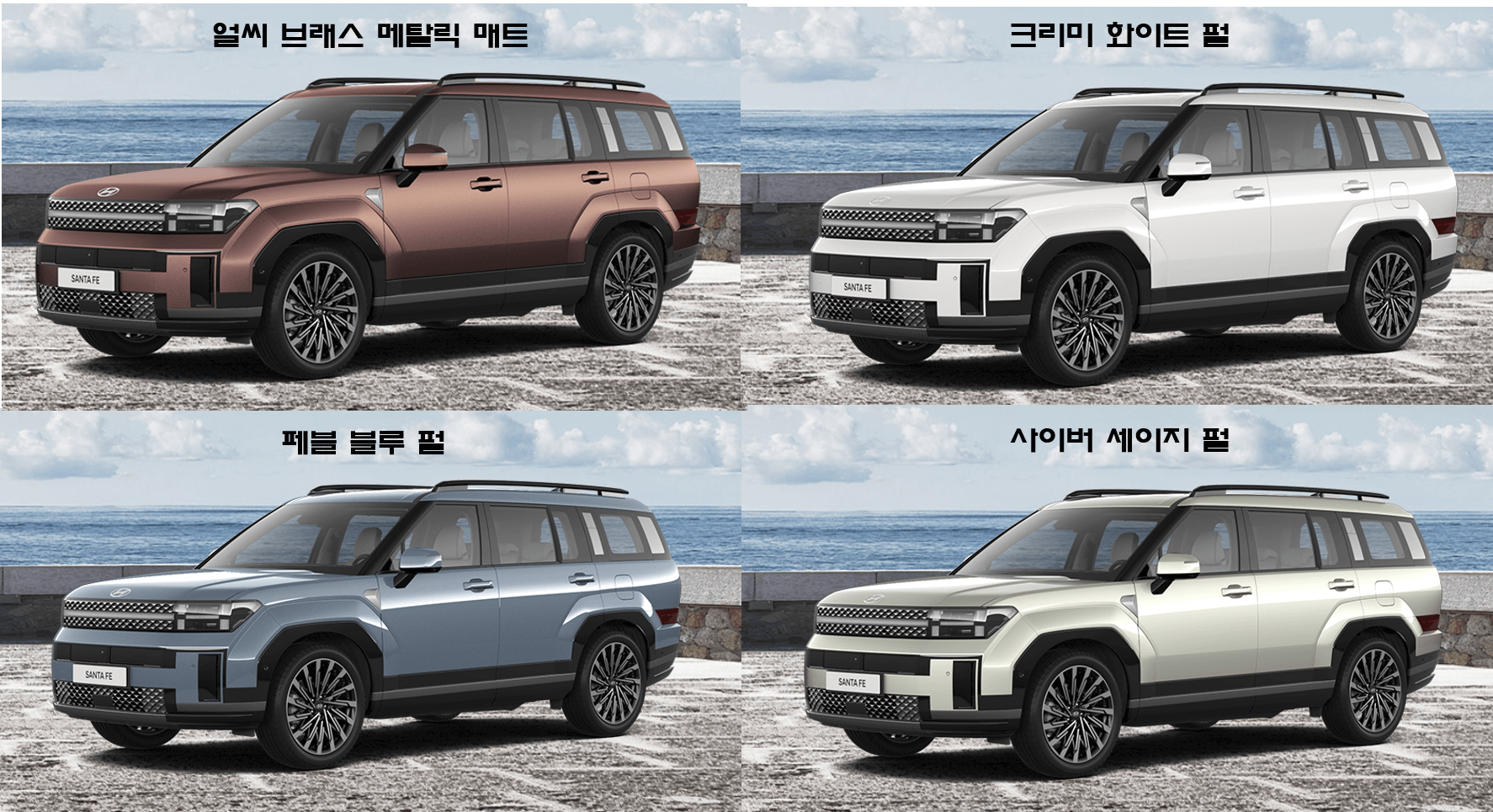 디 올 뉴 싼타페의 익스테리어 색상입니다. 기본적으로 얼씨 브래스 메탈릭 매트, 크리미 화이트펄, 페블 블루 펄, 사이버 세이지 펄, 오카도 그린 펄, 테라코타 오렌지, 마그네틱 그레이 메탈릭, 어비스 블랙 펄 이렇게 총 8개의 색상으로 구성되어 있습니다. 캘리그래피 트림에서 블랙잉크 옵션을 선택할 경우에는 어비스 블랙 펄, 크리미 화이트 펄, 크리미 화이트 매트 이렇게 3가지의 색상 중 1 가지를 선택할 수 있습니다.