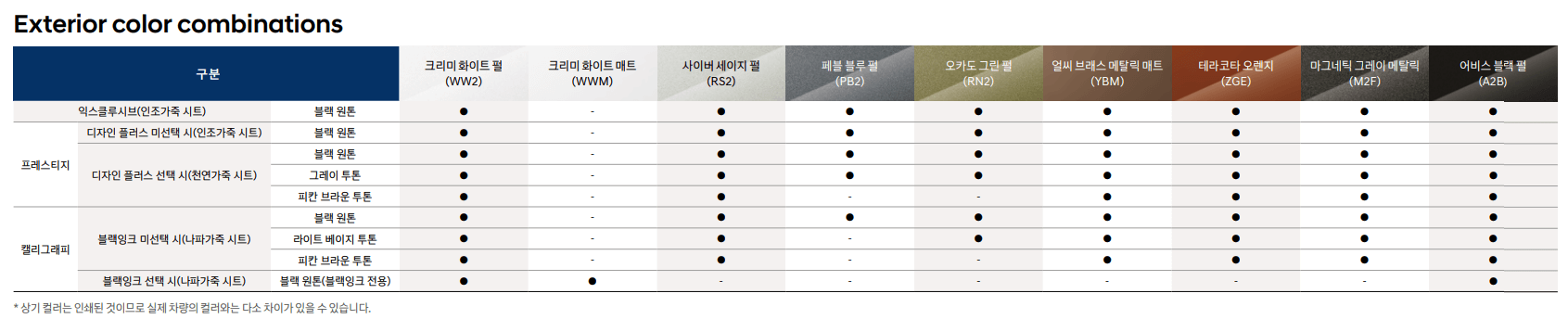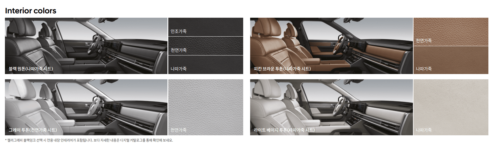다음은 인테리어 색상입니다. 인테리어 색상은 블랙원톤(인조가죽, 천연가죽, 나파가죽) / 피칸 브라운 투톤(천연가죽, 나파가죽) / 그레이 투톤(천연가죽) / 라이트 베이지 투톤(나파가죽)으로 구성되어 있으며 트림별, 색상별로 선택할 수 있는 인테리어 색상이 다릅니다. 자세한 내용은 아래의 사진을 참고해 주시기 바랍니다.