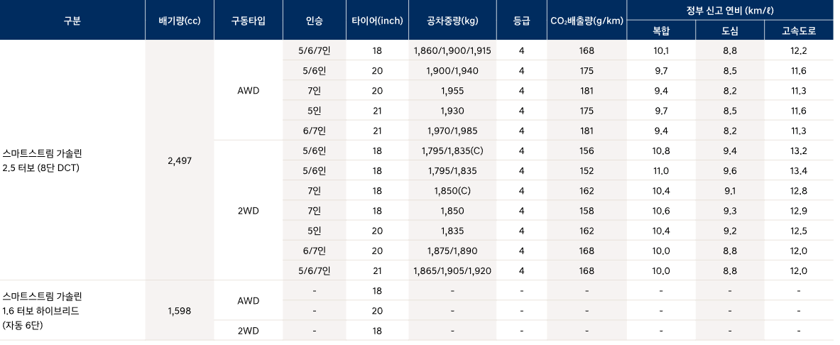 | 2.5 AWD | 3,769만 원~ | 4,017만 원~ | 4,596만 원~ |