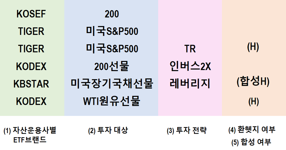 이렇게 ETF 이름을 보고 어떤 자산운용사에서 출시한 ETF인가? / 어디에 투자하는가? / 어떤 운용 전략을 사용하는가? / 환헷지가 되는 상품인가? / 합성 상품인가? 에 대한 정보를 알 수 있습니다.
