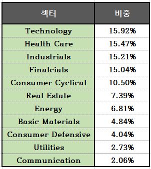 기술주가 15.92%로 가장 높은 비중을 보이며, 헬스케어, 산업재, 금융섹터가 약 15%정도로 그 뒤를 잇고 있습니다. 그 뒤로 부동산, 에너지, 원자재, 경기방어, 유틸리티, 통신주 순서로 비중을 차지하고 있습니다. 한 섹터에 크게 편중되지 않고 골고루 분산되어 있는 모습입니다.