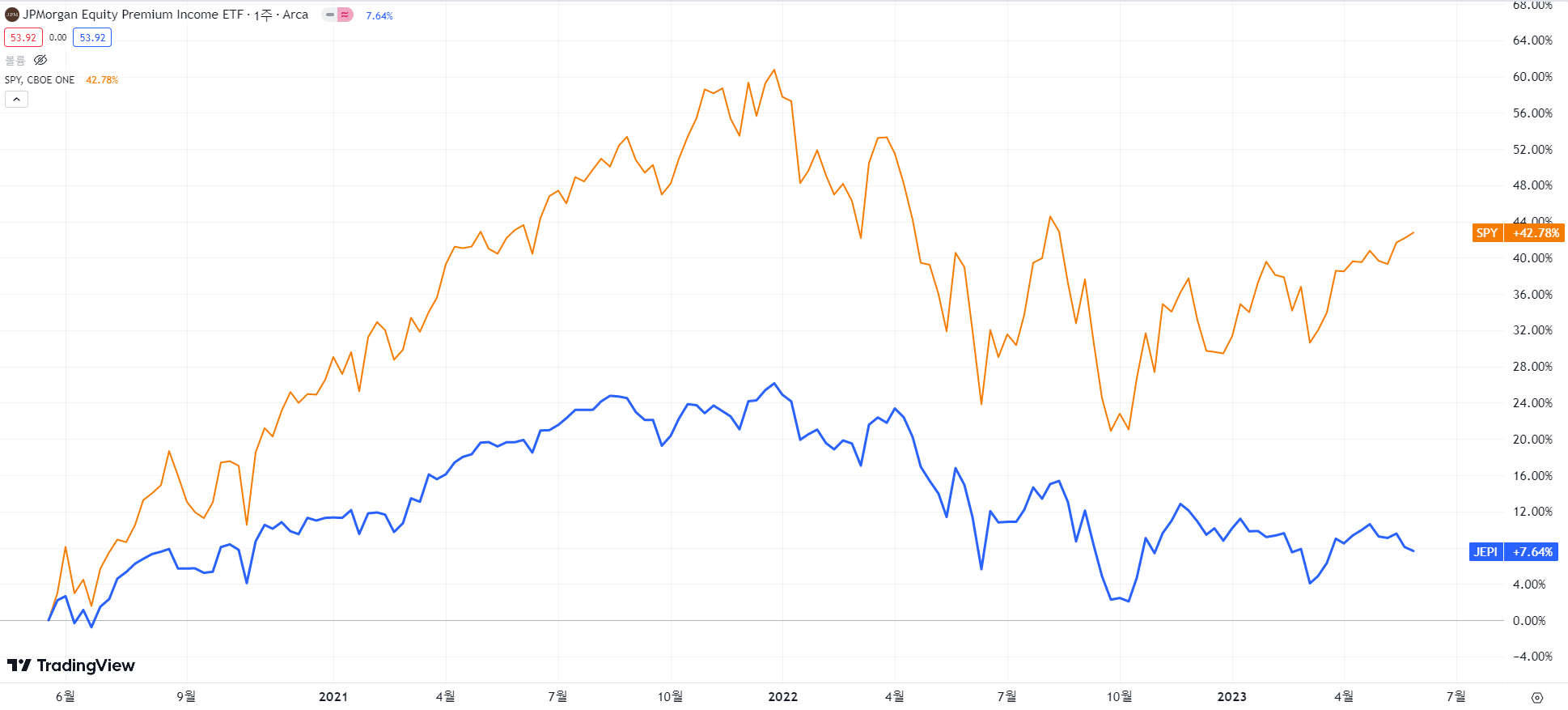 JEPI의 상장이후 주가 흐름을 SPY와 비교해 봤습니다.