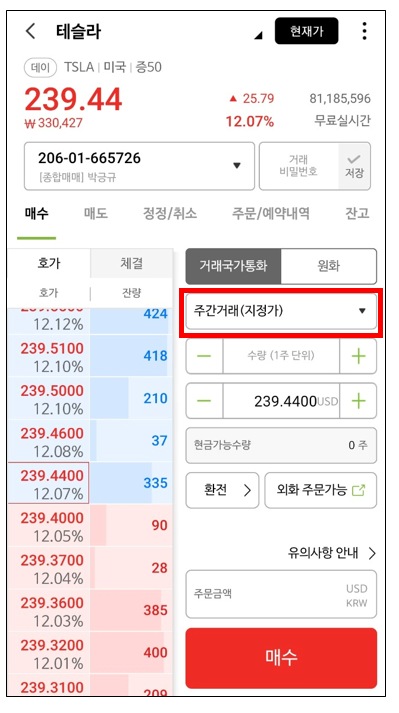 먼저 원하는 종목 매수창에서 거래 유형을 선택한 후 LOC(장마감지정가)를 선택해 줍니다. 테슬라는 3분기 호실적으로 시간 외 거래에서 12%가 상승 중이네요...