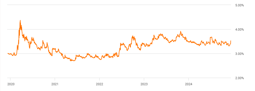 위의 그래프에서 보시다시피, SCHD의 배당수익률은 최근 5년간 3~4% 사이에서 왔다 갔다 했습니다. 코로나 직후 주가가 급락하였던 시기에 4%를 넘어갔던 것을 제외하면 대부분은 3%대에서 움직였습니다.