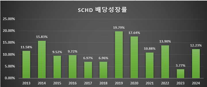 1~4분기 합산 2023년 대비 2024년의 SCHD 배당성장률은 12.23%입니다. 최근 10년 SCHD의 평균 배당성장률이 약 11%인 것을 감안하면 그 이상의 배당성장을 했으므로 굉장히 준수한 배당성장률이라는 생각이 듭니다. 2분기의 배당성장률이 약 24%로 굉장히 크게 성장했던 것이 큰 역할을 한 것 같습니다.