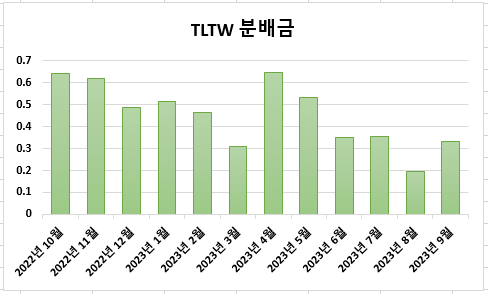 TLTW의 23년 9월 주당 분배금은 0.332475 달러입니다. 지난달에 비해서 증가하기는 했지만 지급까지 지급해왔던 분배금액을 봤을 때, 아직 안심(?)할만한 금액이 아닌 것은 사실입니다. TLTW의 고배당을 보고 매수하신 분들은 다소 실망스러운 분배금 일수도 있겠다는 생각이 드는데요, 아래에서 연 환산 배당률을 계산해 보도록 하겠습니다.